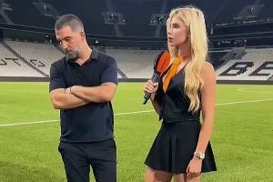 体育资讯08月13日讯 据《每日邮报》报道,在欧联杯资格赛取胜的赛后,顿涅茨克矿工主帅阿尔达-图兰在接受球队美女记者采访时,低头看向另一边,这被解读为对妻子阿斯利汉-多安-图兰忠诚的表现,两人在2018年结婚。