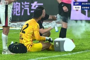 比赛第76分钟时,刘殿座受伤倒地,队医进场对他进行治疗,随后主裁让蓉城队医也给自己的大腿后侧喷上喷雾。